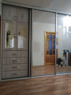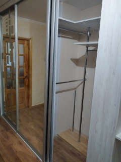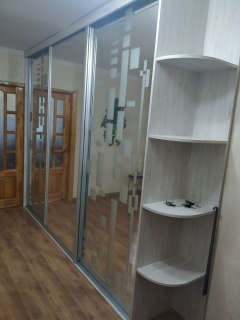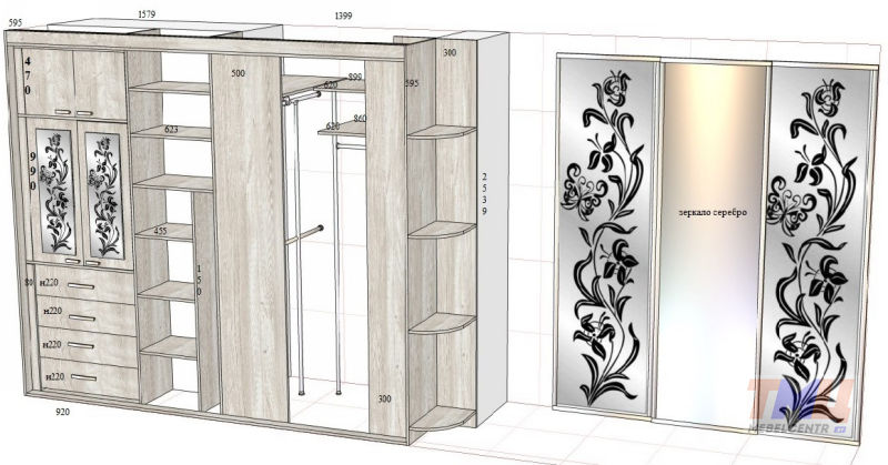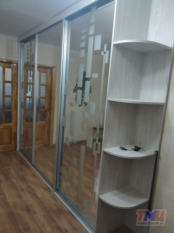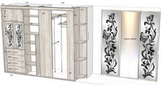Для того, чтобы максимально использовать выделенное под шкаф-купе пространство, можно сделать не только полочки, выдвижные ящики и штанги для верхней одежды. Мы предлагаем различные выдвижные ящики, корзины, пантографы. По желанию прямо в шкафу можно сделать закрытую антресоль и даже соорудить красивый мини-бар с зеркальными дверцами и пескоструем. В представленном варианте по задумке клиента и был сделан такой мини-бар. Дверцы в нем зеркальные, в рамочке и с пескоструйным рисунком повторяющим картинку внешних дверей-купе. Из-за нестандартной планировки в шкафу разная глубина, что не помешало полноценно использовать его наполнение. Также багодаря большой глубине получилась мини-гардеробная с большим количеством труб для плечиков и антресолей.