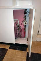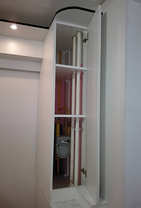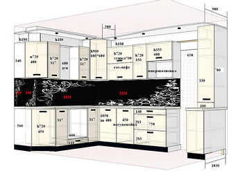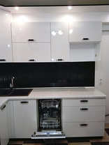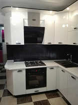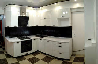 Угловая кухня со встроенной варочной панелью, духовым шкафом и посудомоечной машиной. Каркас кухни выполнен из белого ЛДСП, фасады из пластика светло-кремового оттенка. Верхние шкафчики с вертикальным открыванием дверок оборудованы газ-лифтами. Под духовым шкафом и в правом нижнем шкафчике установлены ящики полного выдвижения. Справа в верхнем шкафчике оборудована ниша для установки микроволновой печки. В контраст основным белым цветам кухни используется черная скиналь с 3D эффектом и черный глянцевый цоколь. В качестве рабочей поверхности используется столешница на основе высококачественной ДСП толщиной 38мм облицованной пластиком. В козырек кухни для дополнительного освещения встроены 5 гологеновых светильников. Различные коммуникации и счетчики, которыми богато кухонное помещение, скрыты в дополнительных шкафчиках.