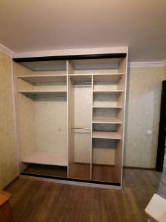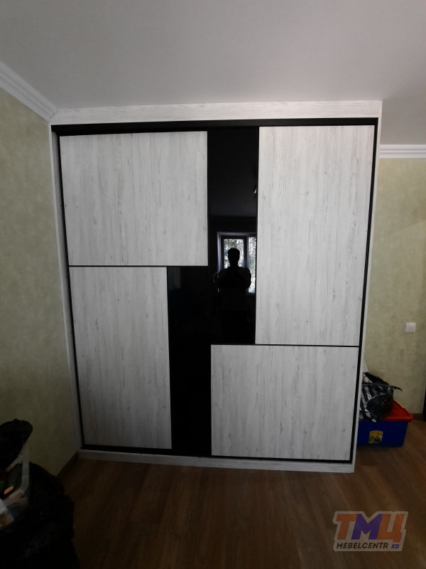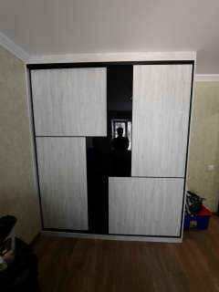 Когда нужен шкаф, но очень хочется сделать его необычным, современным, гармоничным мы начинаем эксперимент с дверями, с различным их наполнением и материалом. В данном шкафу сочетание дсп в цвете Аляска и черного лакобеля весьма выигрышное. Вертикальные вставки лакобеля с тонким профилем смотрятся очень дорого, сдержано и современно. Внутреннее наполнение шкафа стандартное — больше места под верхнюю одежду. Четыре вдвижных ящика. Предусмотрен добор под натяжной потолок.