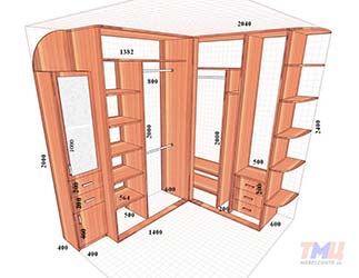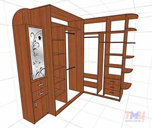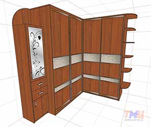 Угловой шкаф выполненный в виде Г-образной конструкции с четырьмя дверями, угловой консолью и дополнительным шкафчиком. В качестве дна и задней стенки используется пол и стены помещения. Основной цвет ЛДСП — «Яблоня темная». Исполнение дверей-купе: ЛДСП 10мм «Яблоня темная» со вставками из искусственной кожи, профиль «Сенатор» закрытый коньячного цвета. Распашная дверца бокового шкафчика декорирована стеклом с нанесенным пескоструйным рисунком.