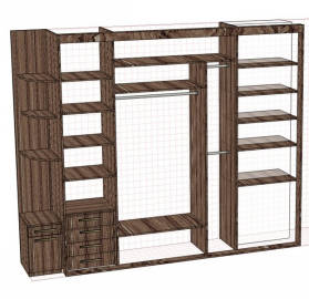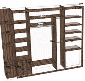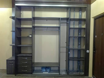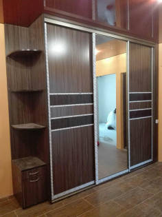 Встроенный шкаф купе с угловой консолью и тумбой. Внутреннее пространство шкафа разделено на четыре вертикальных секции. Цвет корпуса «Индийское дерево». В наполнении раздвижных дверей используется ЛДСП 10мм «Индийское дерево» и горизонтальные вставки искусственной кожи, центральная дверь — серебряное зеркало.
