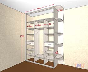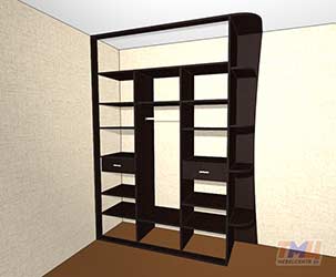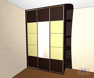 Встроенный прямой шкаф-купе с тремя дверями и угловой консолью. В качестве дна, потолка и задней стенки шкафа используются соответственно пол, потолок и стены помещения. Основной цвет ЛДСП — «Дуб венге темный». Раздвижные двери собраны на профиле «Лазурит» цвета шампань. В наполнении левой и правой двери используется сочетание лакобеля и кожи, центральной — кожи и зеркала.