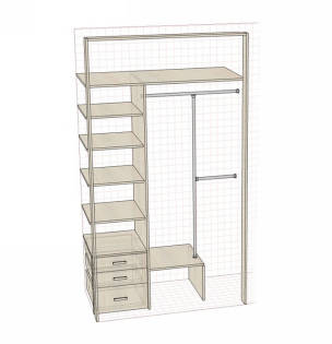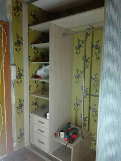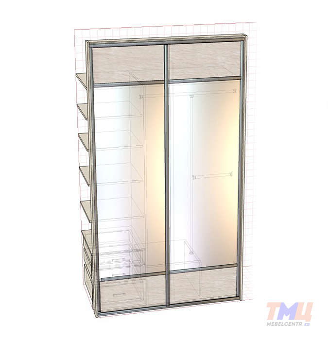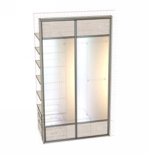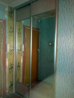 Полностью встроенный в нишу в прихожей шкаф-купе. Внутреннее пространство шкафа разделено на антресоль и две вертикальных секции. Двери сверху и снизу декорированы вставками из искусственной кожи, в середине — серебряное зеркало.