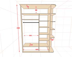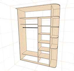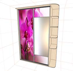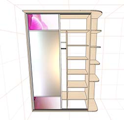 Встроенный в угол двухдверный шкаф-купе с козырьком и угловой консолью. В качестве дна, левой и задней стенки шкафа используются соответственно пол, потолок и стены помещения. Основной цвет ЛДСП — «Береза белая». Раздвижные двери собраны на профиле «Сенатор» открытый цвета шампань. В наполнении дверей используется стекло с фотопечатью и вставка из серебряного зеркала.