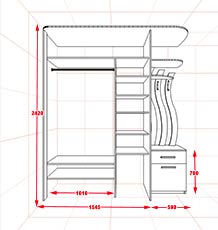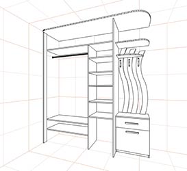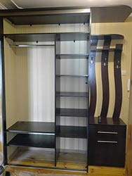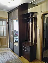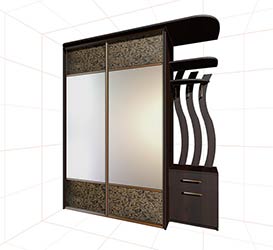 Двухдверный шкаф-купе с козырьком встроенный в угол прихожей. Справа к шкафу пристроен модуль, состоящий из тумбочки, пары полок для головных уборов и крючков для одежды… Основной цвет ЛДСП — «Орех швейцарский». Раздвижные двери собраны на профиле «Лазурит» цвета Шампань. В наполнении дверей используется сочетание кожи и зеркала.