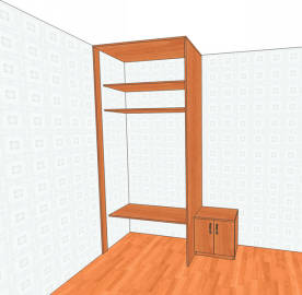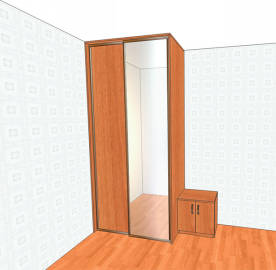 Двухдверный шкаф-купе встроенный в угол прихожей. Полотно одной двери — зеркало, другой — ЛДСП. Справа к шкафу пристроена низкая тумба, дабы на нее можно было бы присесть.