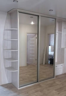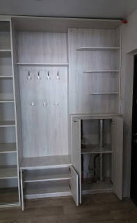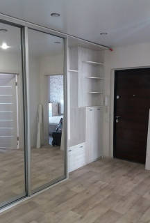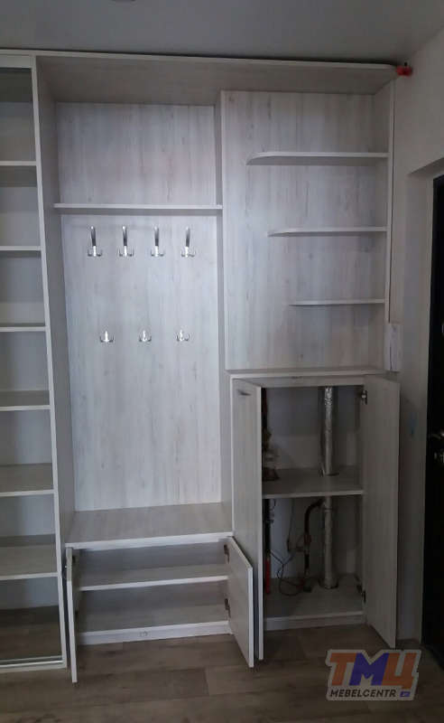 Данная модель шкафа разработана специально для новостроек, с видимыми коммуницацииями со счетчиками, которые нужно скрывать самостоятельно. Чтобы закрыть трубы, оставить счетчики доступными при этом не «красть» полезное пространство мы придумали функциональную тумбу, в которой зашиты коммуникации. Прорстранство позволило поставить не только шкаф-купе, но и открытую площадку с крючками для верхней одежды, сиденьями и тумбой под обувь.